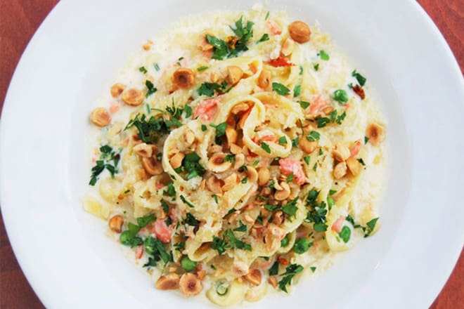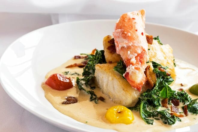 Pero si prefiere los mariscos, pruebe las mejillas de halibut de Alaska a la sartén cocinadas con un poco de Asiago y corteza de panko y servidas con papas Yukon Gold, baby frisee, vinagreta de limón y beurre blanc.