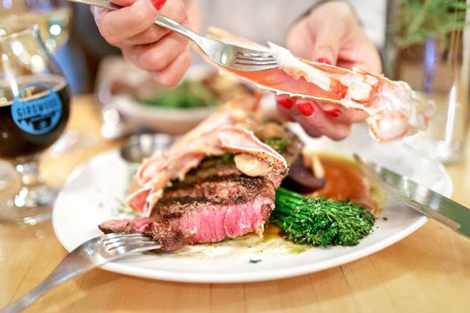Comience con unas ostras de Alaska frescas como aperitivo mientras espera el filete ribeye de primera calidad o las patas de cangrejo real de Alaska, servido con puré de papas, mantequilla derretida y verduras salteadas.