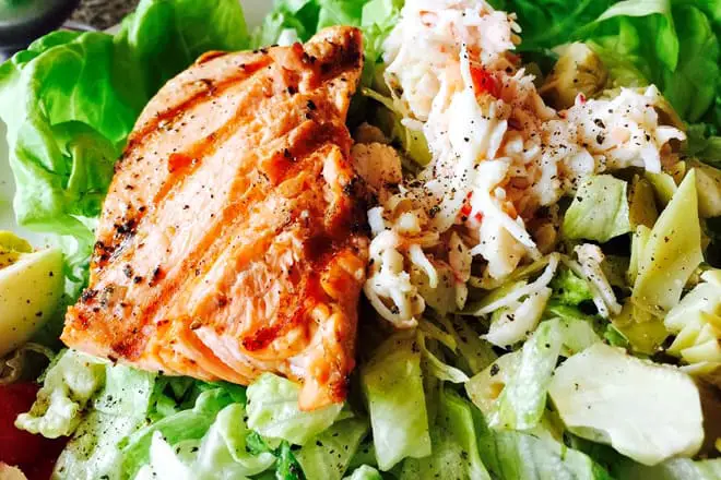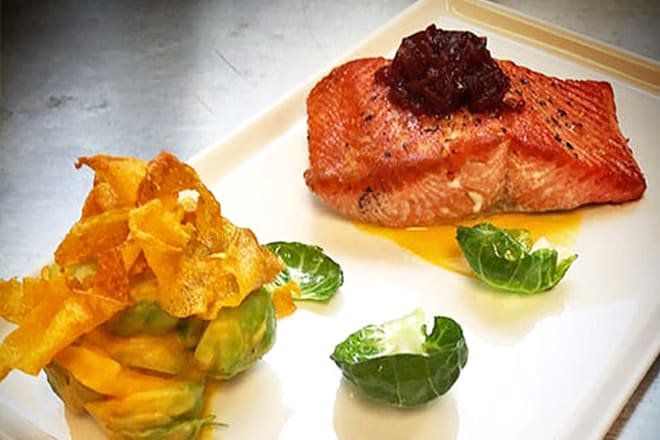 Pida el salmón a la parrilla con aliso de Alaska, servido con papas a la parrilla con aliso, mantequilla de vermut con ajo y limón, tomates tiernos, brócolini y un buen aguacate y lima verde.