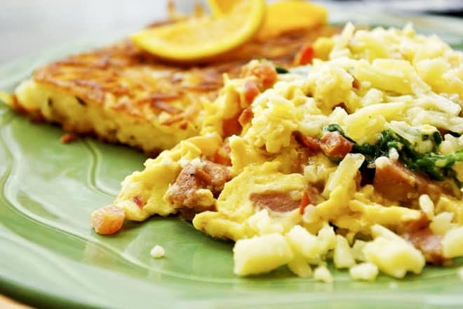 Si va a cenar temprano, pruebe el Spenard Stack, que consiste en papas trituradas, espinacas, tomate, tocino, 2 huevos fritos y un poco de queso Havarti.