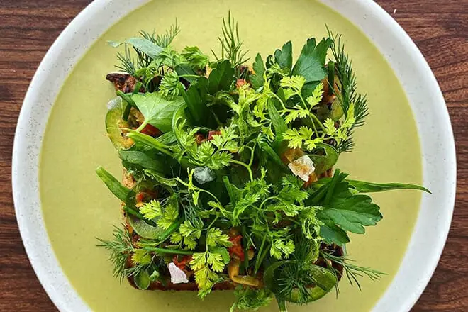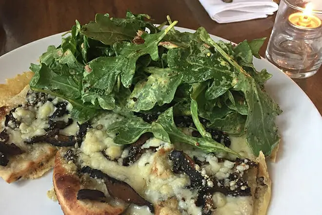 Incluye ensalada de brócoli, salsa de pan casera y farro de champiñones ahumados.