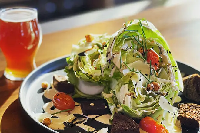 Consiste en corazones de lechuga romana a la parrilla, queso brie tibio, chutney de albaricoque y picatostes caseros.