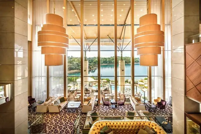 Uno de los mejores hoteles donde alojarse en Croacia, este ofrece una piscina infinita, una playa de guijarros con tumbonas, pontones para acceder fácilmente al agua, así como un campo de golf de 18 hoyos.
