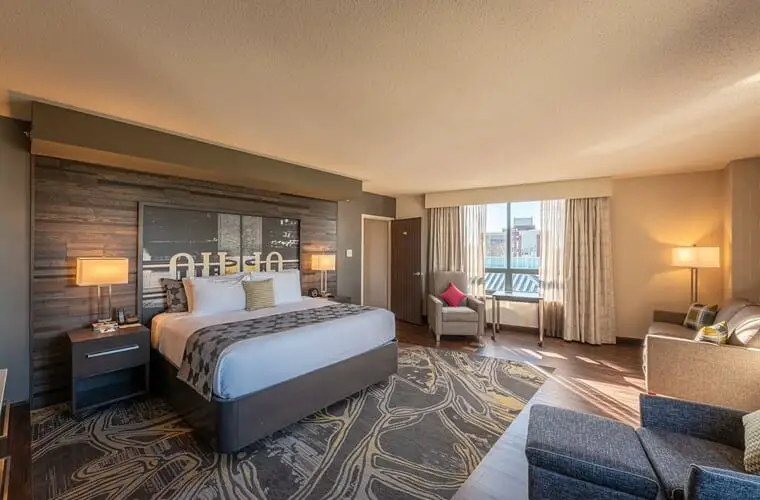 Además, sus suites diseñadas a medida, el exclusivo restaurante y bar deportivo, la cafetería y otras comodidades de primer nivel lo harán sentir como si estuviera en uno de los mejores hoteles de 5 estrellas en Columbus.