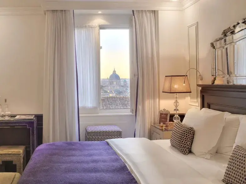 Reconocido como uno de los hoteles de lujo más famosos de Roma, el Hotel Hassler Roma se encuentra justo encima de la Plaza de España y ofrece vistas legendarias de la Ciudad Eterna. Reserve la habitación 501 y podrá disfrutar de una vista directa de las torres de la iglesia y un balcón para dos personas con vista a St. Peter's y Janiculum Hill. En el sexto piso se encuentra el Imago, galardonado con una estrella Michelin, que brinda la oportunidad de cenar comida italiana excepcional mientras disfruta de una vista imponente de la ciudad. El Spa Amorvero, disponible solo para huéspedes, ofrece masajes en la terraza.