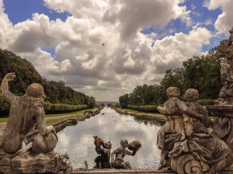 El Palacio Real de Caserta, diseñado y construido en su mayor parte por el arquitecto holandés Ludwig Van Wittel, que recibió el nombre onomatopéyico italiano de Vanvitelli, es el orgullo de la dinastía de los Borbones, cuya primera piedra se colocó el 20 de enero de 1752, en una ceremonia oficial. celebrando el 36 cumpleaños del rey Carlos. Su impacto visual es inmediato, con el conjunto de fuentes al fondo complementando la grandiosidad. En el interior, las enormes salas se suceden una tras otra, todas extraordinariamente opulentas, desde los aposentos reales hasta la sala del trono. El palacio también cuenta con un teatro, el único espacio completamente completado por el propio Vanvitelli antes de morir. Si bien los yesos y los frescos lo convierten en un lugar impresionante, lo que es más singular es el escenario, donde detrás del telón hay un portal que se abre al parque, utilizado como escenario para obras de teatro.