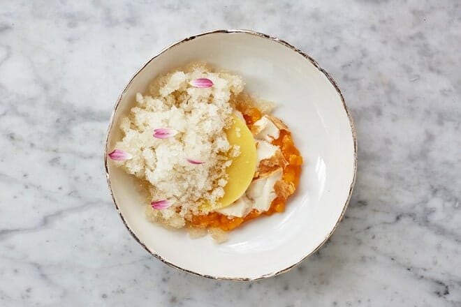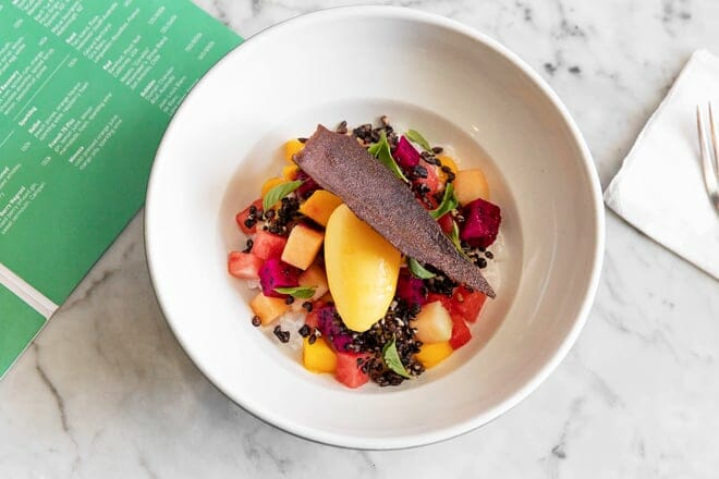 Room 4 Dessert es un lugar de postres inspirado en la naturaleza con un huerto y vistas a una exuberante vegetación.