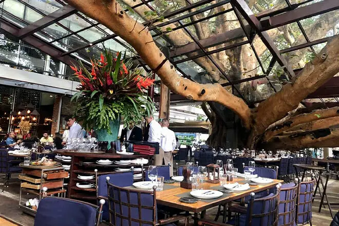 El restaurante, que está construido alrededor de una higuera antigua y gigante, continúa el ambiente natural con una amplia terraza de madera y muebles de madera, creando una escena similar a la de una jungla.