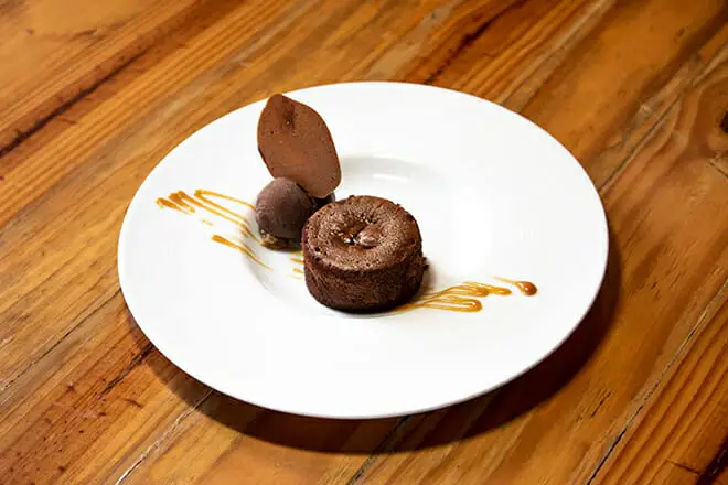 Prueba la Tarta de Chocolate de postre, con sus sabores dulces que complementan el plato principal.