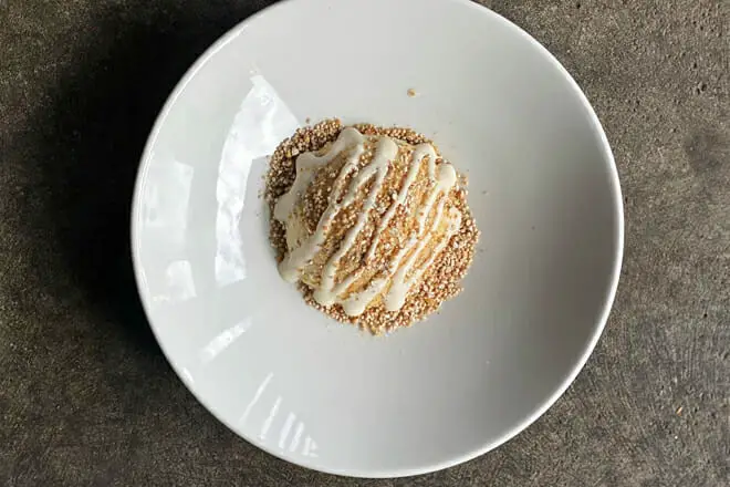 Se sirve sobre tostadas francesas y se cubre con miel y nueces confitadas.