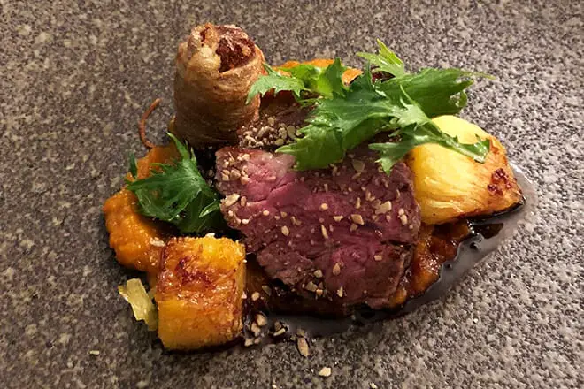 Luego, opte por su sabroso tempura de calabacín y su suculento filete de ternera.