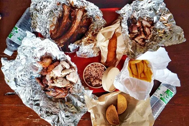 Obtenga una variedad de carnes cocidas a fuego lento mientras esté aquí (cerdo y pollo) y agregue algunos acompañamientos como ñame asado y bammy.