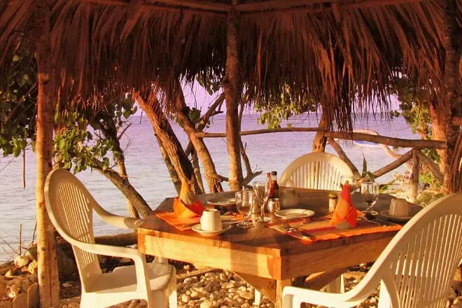 Podrás sentarte en sillas de bambú alrededor de una mesa con techo de paja mientras comes comida jamaicana sencilla pero sabrosa.