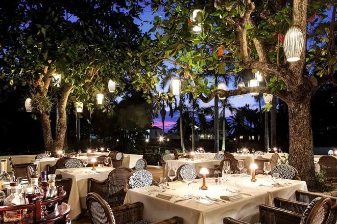 Los árboles imponentes, las luces flotantes, las mesas iluminadas con velas y la fresca brisa del mar crean un ambiente romántico y sofisticado cuando cena aquí.