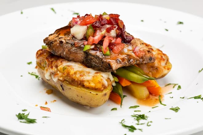 Como plato principal, compre la brocheta de Salomón (carne de res, cerdo y mariscos) con una guarnición de papa gratinada.
