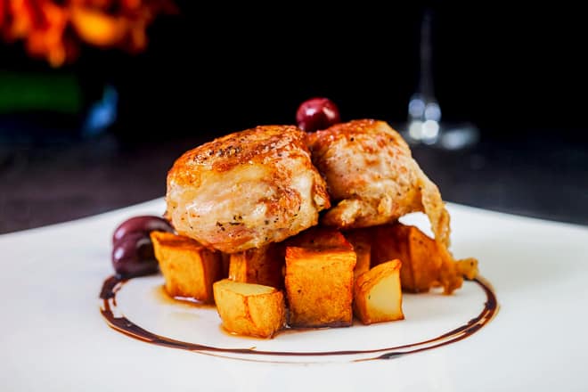 Elija la Terrina de Foie Gras y el Solomillo de ternera acompañados de una copa de vino fría.