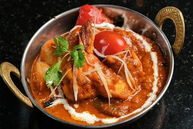 Luego, tome un plato de Amritsari Prawn Masala servido con arroz con azafrán.