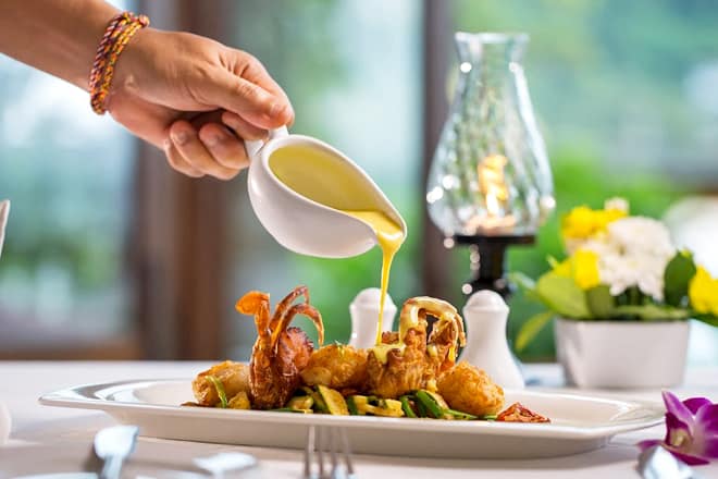 Combinando elegancia y modernidad con la sensación lujosa de la naturaleza, este restaurante se encuentra entre los mejores lugares para cenar en Phuket para citas románticas y ocasiones especiales.