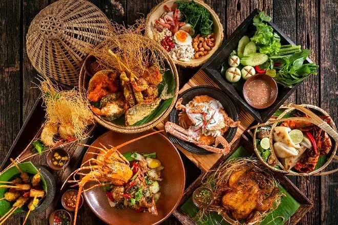 Elija platos como gambas fritas con salsa de curry tailandés y cangrejo azul al vapor.