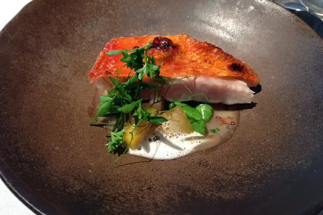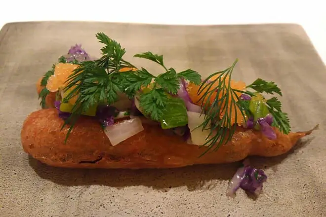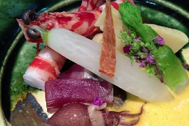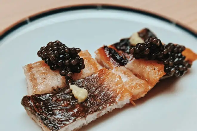 También está la roseta Sanma chamuscada rápidamente, que se envuelve alrededor de astillas de myoga de jengibre y se sirve en una emulsión mantecosa cubierta de caviar que es ideal para los entusiastas del pescado.
