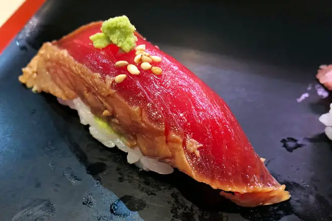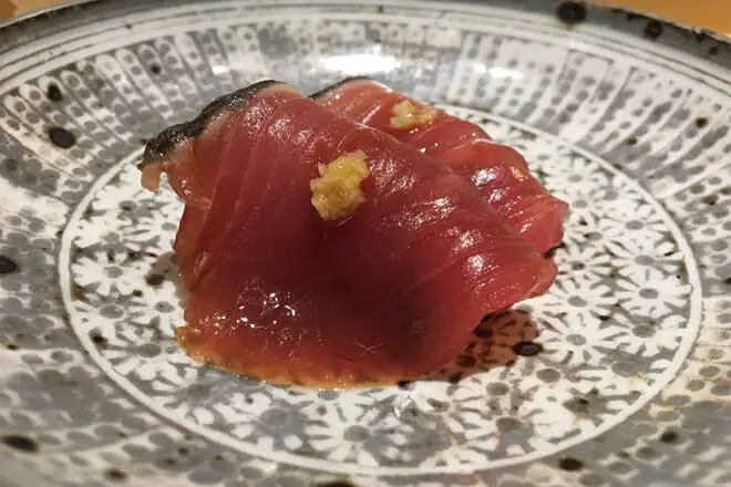 También hay bonito con cebollino fresco, erizo de mar espeso y cremoso y gambas dulces al estilo aburi (asadas con soplete).