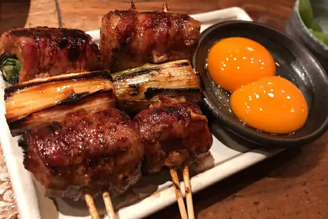 Se encuentran disponibles kebabs simples que van desde muslos de pollo maravillosamente suaves hasta "sunagimo" o molleja de pollo, pero hay algunos elementos más del menú que vale la pena probar.