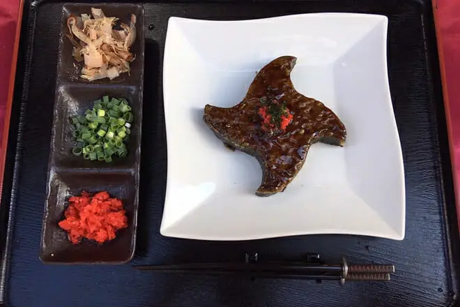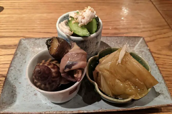 Se encuentran disponibles clásicos como sashimi mixto, ensalada de papas y edamame, al igual que alimentos más inusuales como tofu con queso cheddar, tripas de calamar saladas (shiokara) y kimchi de entrañas de pescado.