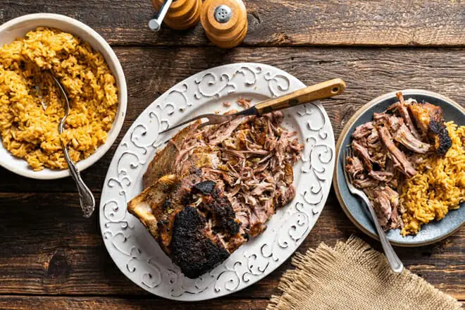 | Pernil | Paletilla de cerdo, especias | asado a fuego lento | Arroz con Gandules |