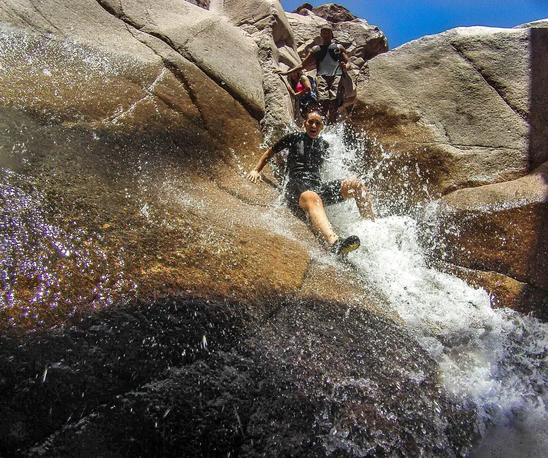 Te encontrarás vadeando desde la cintura hasta los canales de agua hasta el pecho que se entretejen a través de las coloridas paredes rosadas. Muchos toboganes de agua naturales aparecen a lo largo de la ruta; tenga cuidado, pero considere probar el Slip n' Slide de la naturaleza. A veces, los aventureros tendrán que nadar a través de piscinas azules cristalinas más profundas, así que asegúrese de que todos en el grupo sean buenos nadadores.