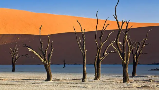 - Mejor época para visitar : las espectaculares dunas de arena de Sossusvlei se pueden visitar en cualquier época del año, pero los meses secos de invierno de mayo a octubre son ampliamente considerados como el mejor momento para visitar Namibia para ver animales, especialmente en el Parque Nacional de Etosha. Los cielos están despejados, el riesgo de malaria es mínimo y los animales se concentran cada vez más alrededor de las fuentes de agua a medida que avanza la estación seca.
