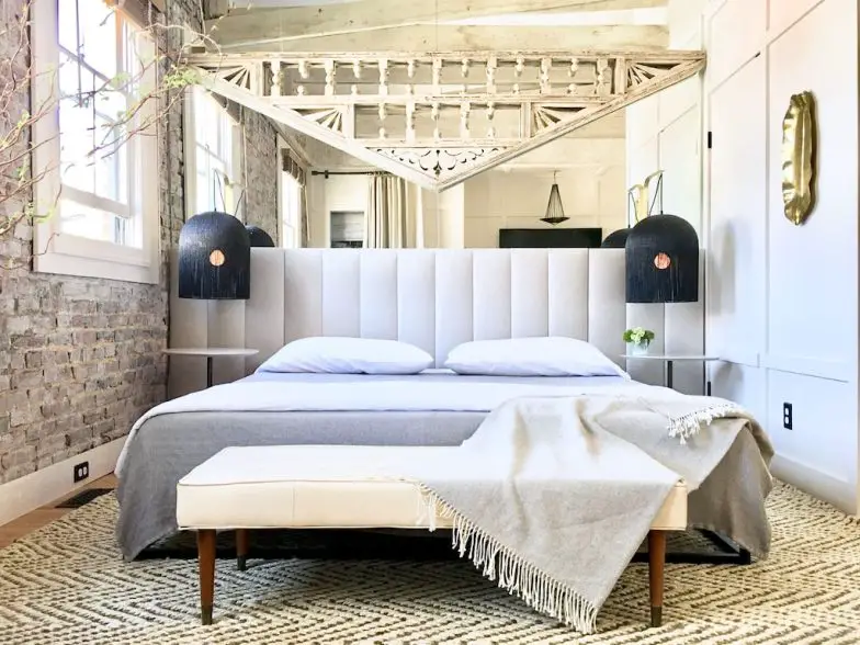 This three-level brick townhouse is a perfect setting for a relaxing getaway for families or friends. With 2 bedrooms, 2.5 bathrooms, and sleeping four, it has high ceilings and a wood-burning fireplace for those chilly nights. The bottom level is perfect for relaxing while the upper level houses both bedrooms. There’s even a fenced deck with chairs and a fire pit to relax around when not enjoying the local restaurants and bars.