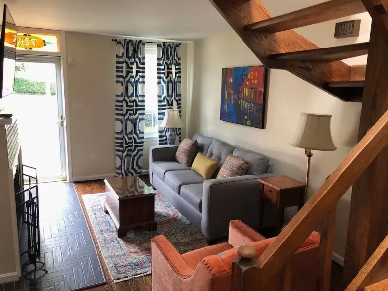 A pet-friendly getaway, this 2 bedroom, 1 bathroom house is located in a quaint row of townhouses close to restaurants and shops. The lower level has a dining room, modern kitchen, and living room that has a working fireplace. On the top level are both bedrooms allowing everyone to have their space or let the children sleep while adults stay up to chat. When the weather is nice, head to the fenced-in patio to relax.