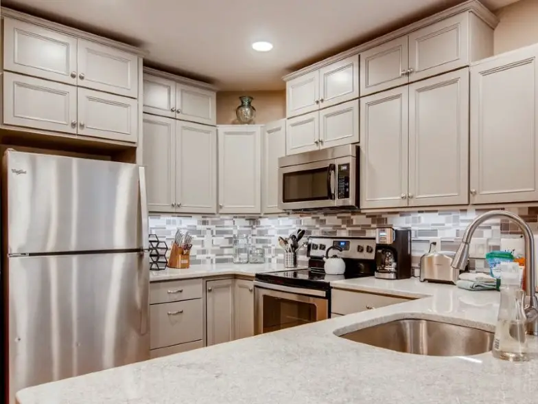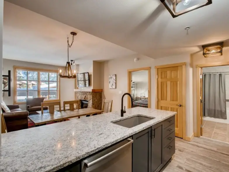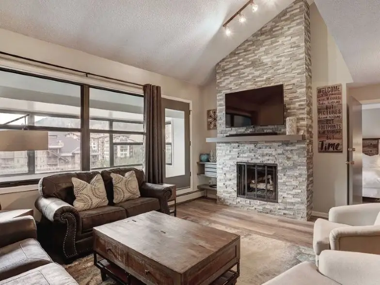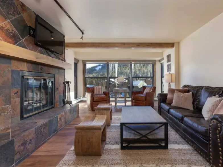 Guests will feel like they’ve entered a sleek mountain lodge when arriving for their stay. The sliced log accent wall, the striking dark fireplace, and the ambient light tie so well together. If you can break away from all the interior beauty, Center Village, filled with shops and restaurants, is just outside.