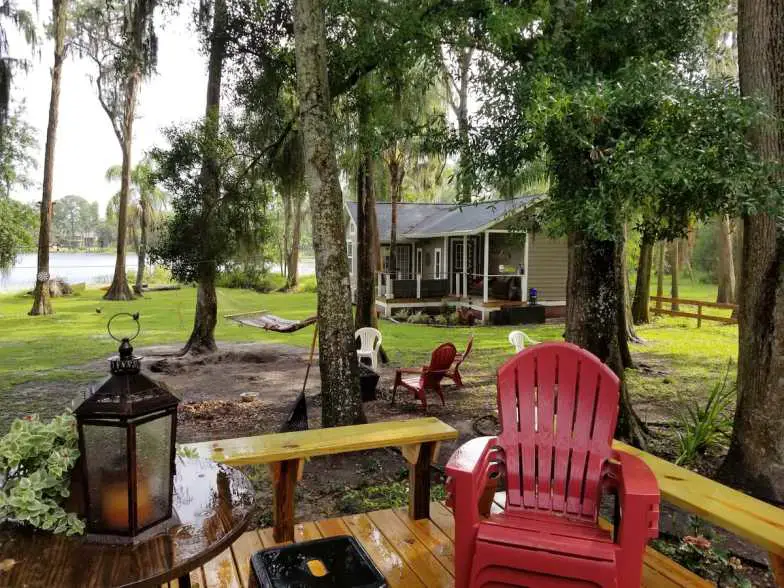 Eight people can stay at this ranch guest house that has four bedrooms and 2.5 bathrooms in 2,160 square feet of space. It’s a Central Florida vacation rental that’s about halfway between Tampa and Ocala. The ranch spans about 120 acres and has eight lakes. It’s a lovely spot for fishing, walking on the trails, and taking out your own kayak or canoe. For an extra fee, you can board your horse overnight at the stables. The location of this farm stay experience is convenient for visiting Busch Gardens and the Disney attractions.