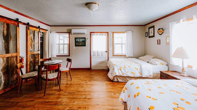 This farmhouse sleeps four people and is a vintage cabin with views of a lake. It has two bedrooms and one bathroom on an organic blueberry orchard. There is a lot of wildlife in this area and also wooded trails and opportunities to go blueberry or pear picking in the right season. There are actually two cabins available to rent on this property, and both are one-of-a-kind vintage spots.