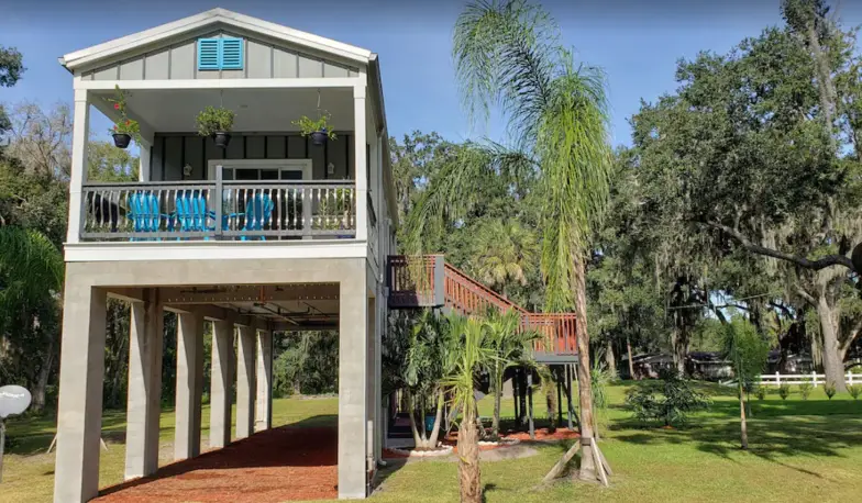 Situated on five acres of land in Plant City, this stilt house has one bedroom and one bathroom to accommodate four people. For sleeping, it has a king-size bed in the bedroom and a queen-size sofa bed in the living room. The home comes with laundry machines and supplies, a walk-in shower in the bathroom, toiletries for the bathroom, and a Blu-ray DVD player. This farm stay experience is unique because it’s by a strawberry field, which is plowed in August or September and produces strawberries until March or April.